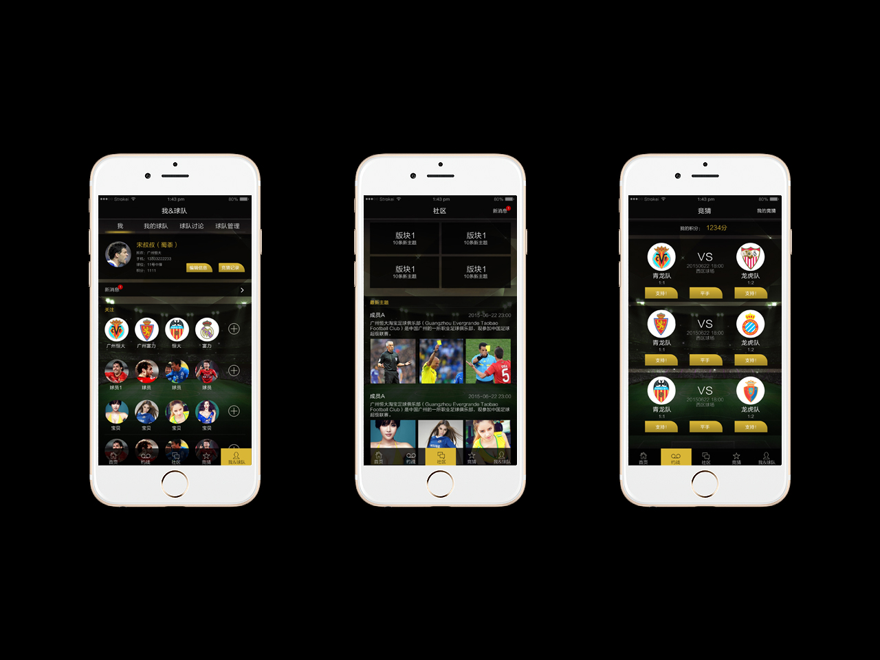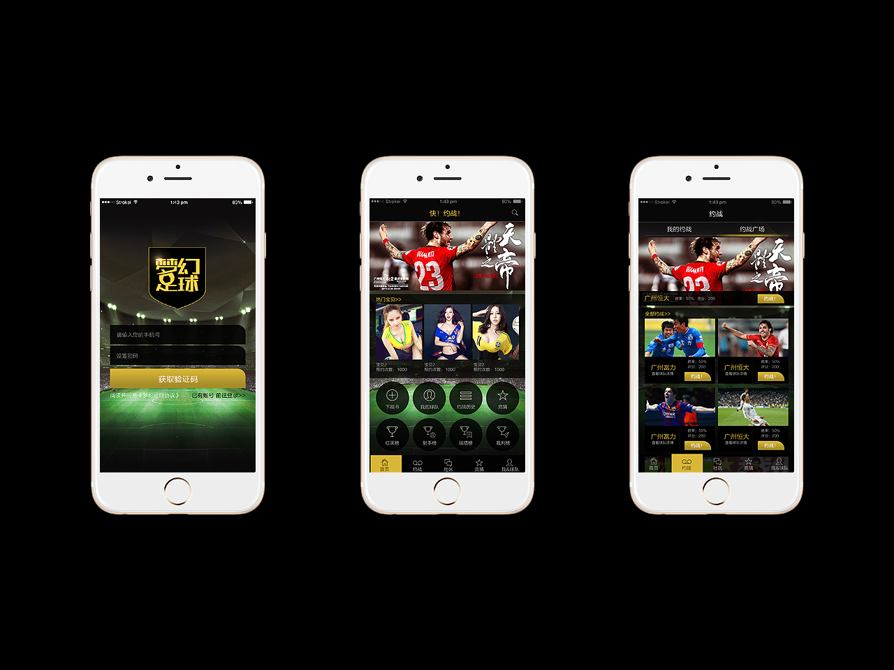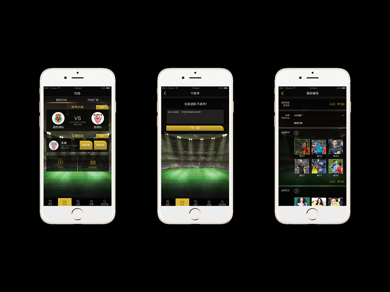 APP设计开发 快.约战APP是一款基于足球组队,并线上与其他球队下帖约战,并且可以租用裁判和足球宝贝的社交类APP。里面同时还包含了球队内部讨论区,所有队员和会员的公众社区,还接收几大知名联赛(中超、英超、德甲、西甲)的即时数据,让会员可以利用自有积分进行竞猜等功能。