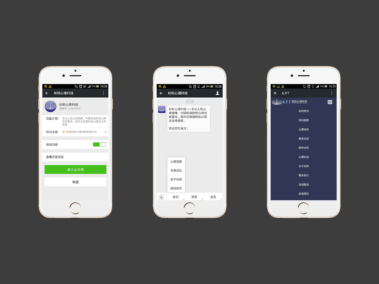 微信公众号二次开发 知和心理是一家包括心理咨询、教育培训和心理科技研发的多元心理健康服务企业,尤其在婚恋与性心理健康专业的独特优势,整合国内性医学、性心理学、性社会学界的专家资源,与医疗界建立“生物-心理-社会”模式的合作。