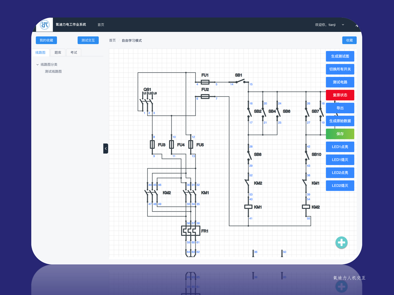 电工培训人机交互教学系统开发 通过立柜式触摸屏的人为操作,通过后端定制开发的软件计算,学生可以通过触摸屏就可以完成:电工接线、各类元器件的学习和掌握。并且通过后台存储的学员的练习数据,纠错改正,让学员更快的掌握,让老师更有教学质量,摈弃了原来手把手的落后教学模式。